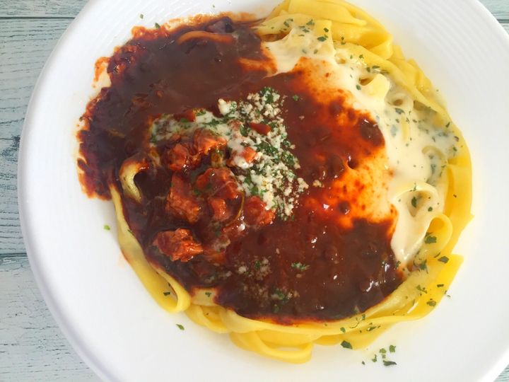 2種類のソースがしっかり絡み合い、濃厚な味わいなので、一皿で満腹に。