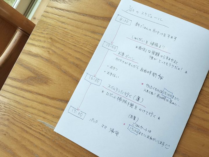 我が家のそんな過去の事案を解決してくれたのは、簡単な『スケジュール表』を作ること。普段から学校の時間割で動いている習慣もついているので、割と上手く動いてくれました。ある日書き忘れて出勤した日には 『ママ、あれあった方がいい。明日は書いてね』と言われたこともあるほど。