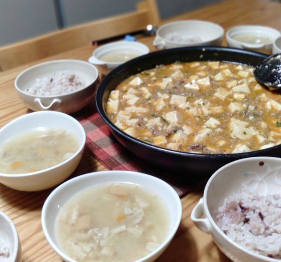 簡単に出来ちゃう丸美屋さんの【麻婆豆腐の素】を使い、ひき肉・ネギ・ニラ・乾燥椎茸をミルミキサーしたものをたっぷりプラスして栄養価をアップ。