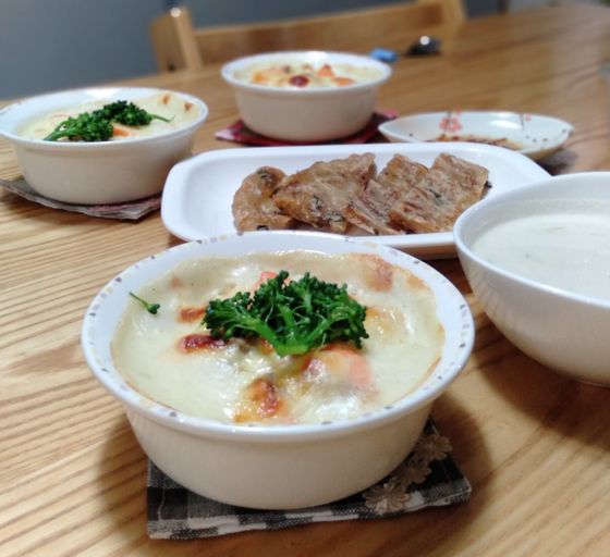 旦那さんがお休みだったのでグラタンを作ってもらいました。