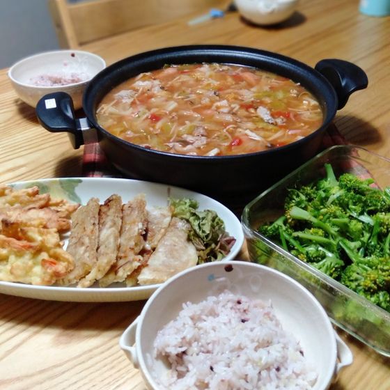 野菜たっぷりのスープにはトマト鍋に使ったトマト缶の残りを入れて、この日無性に食べたかったお餅を入れてみました。