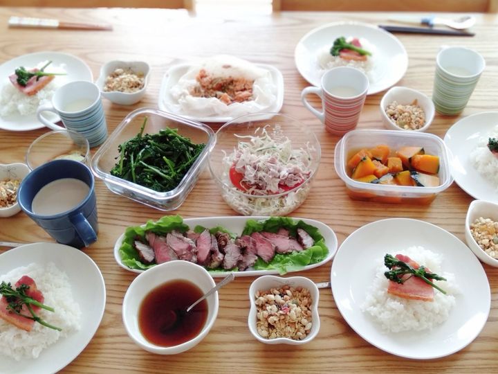 こちらの写真は冷凍・冷蔵の残り物を出して、ベーコンを焼き、グラノーラを入れただけの週末の朝ごはんです。