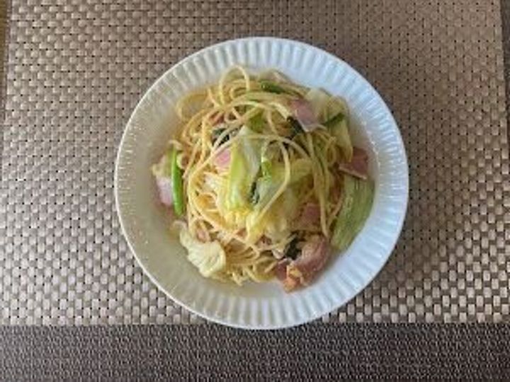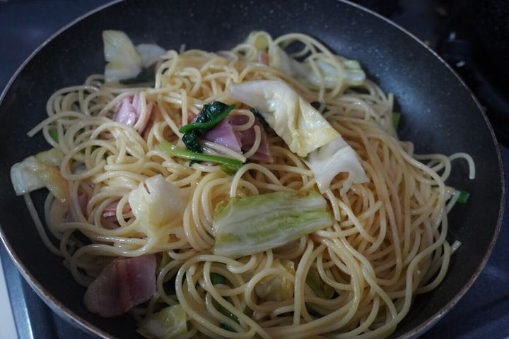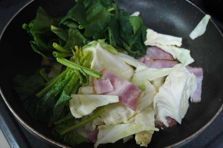 ちなみにこの日は冷蔵庫にあったベーコンとほうれん草、キャベツを使いました。