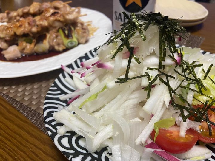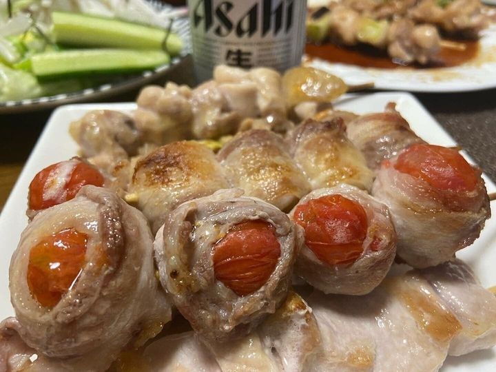 ちなみにこの日は焼き鳥(もも肉・ねぎま)をタレで、豚バラ・薄切りのバラ肉を巻いたトマト・バラ肉を巻いたネギなどを塩を振ってグリルで焼きました!