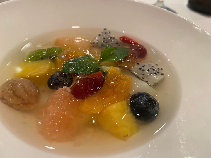 お食事物はライスヌードルでデザートは愛玉子とフルーツたっぷりの杏仁豆腐でした。