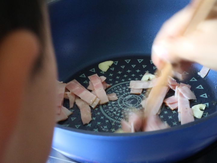 2、 鍋を熱してオリーブオイルを入れ、にんにくを炒める。香りが立ったら、ベーコン、野菜の順で炒める。