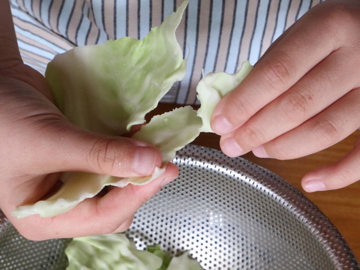 1、 じゃがいも、にんじん、玉ねぎは1cm角に切る。キャベツは適当な大きさに手でちぎる。ベーコンは7~8㎜幅、にんにくは薄切りにする。
