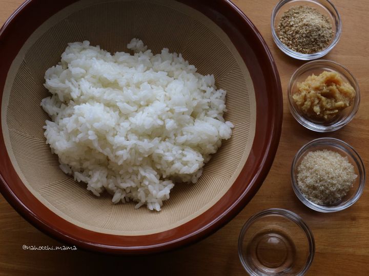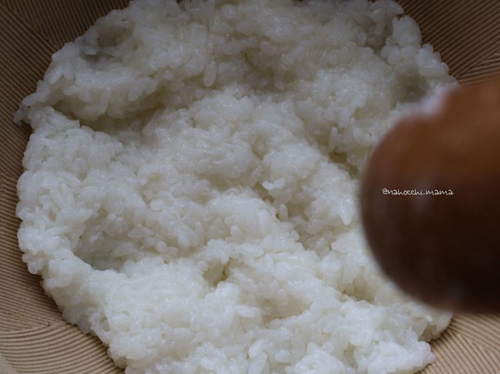 1、 ご飯を温め、すりこぎ等で突いて粘り気を出す。