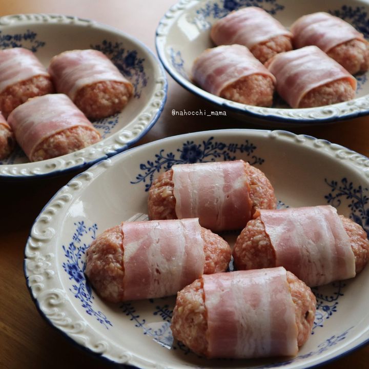 2、 1を60〜70gずつで俵型に形を整え、ベーコンでまく。