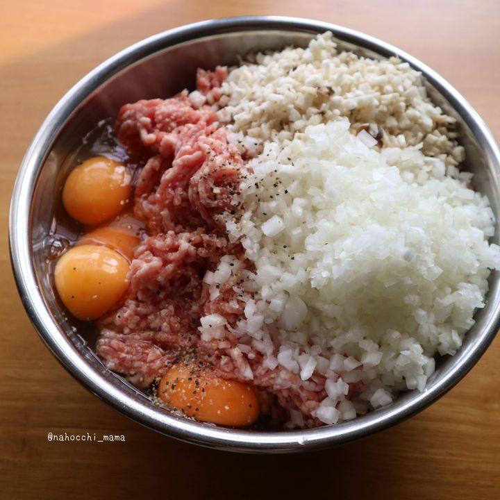 1、 ベーコン以外の材料を混ぜ合わせる。