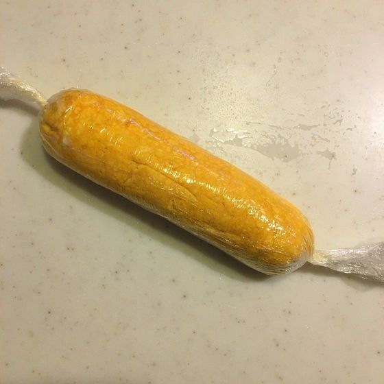 適当に作った卵焼きの形を整えたい時はラップが便利です。ラップを広げて卵焼きをのせ、くるくるっとキャンディーのように形を整えます。