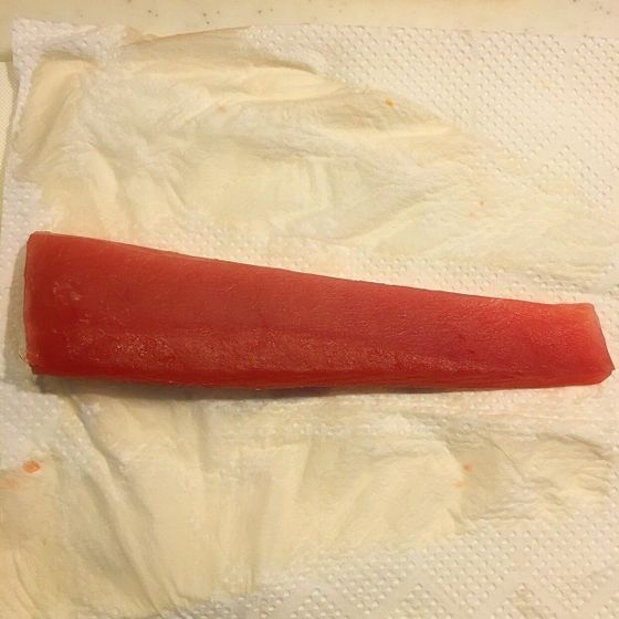 お刺身用のお魚はキッチンペーパーなどでしっかりと水気をとります。こうすると漬けダレが水気でぼやけずに味がしっかりと漬かります。