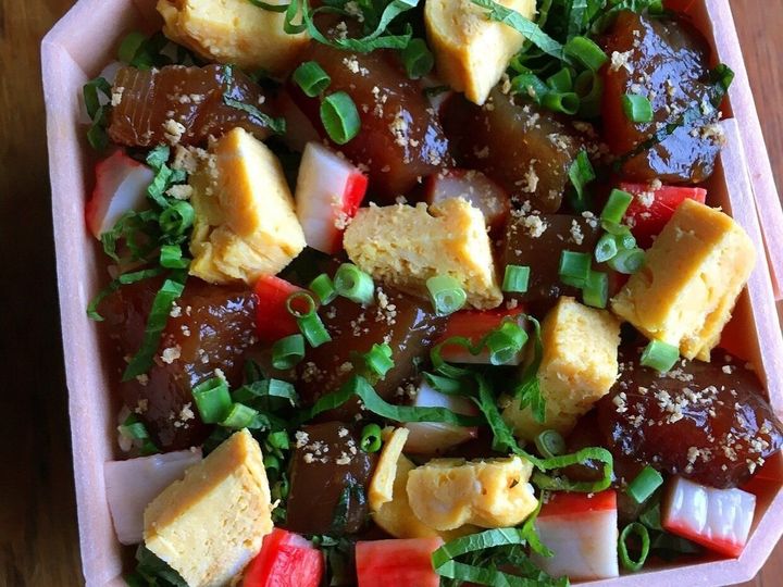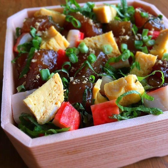 今回お刺身はキハダマグロを使用しましたが、ブリ、鰹、鮭、鯛、刺身の切り落としでもOK。