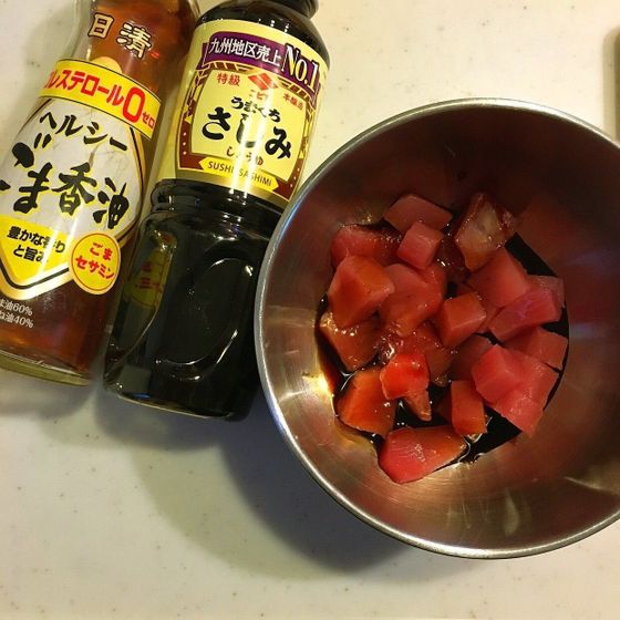 お刺身をコロコロっとした一口サイズに切ってボウルに入れ醤油とゴマ油を加えひと混ぜします。醤油大さじ1に対してゴマ油小さじ1程。お刺身の下半分が浸かるぐらいの量でOKです。