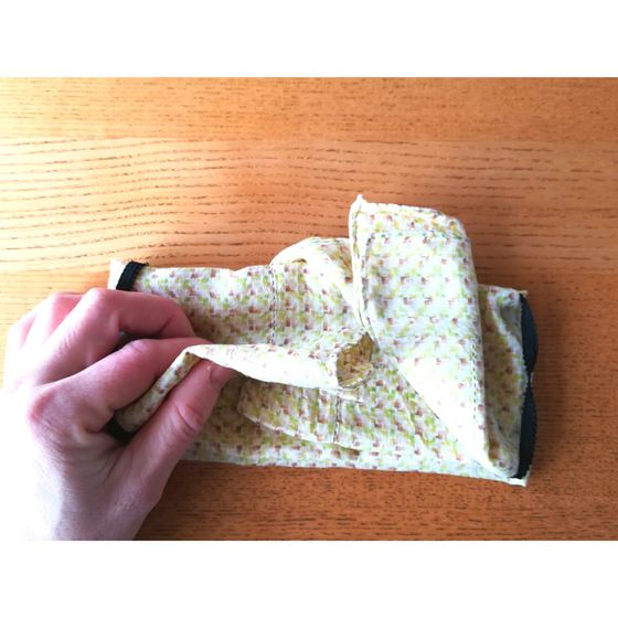 ②ゴムを両脇に通したら、ハンカチを左右から中心に向けて少し重なるようにたたみます。