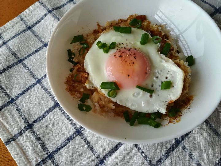 お米の上におかかをかけて、目玉焼き+塩をかけただけ。彩りの小ねぎはベランダ菜園で育てたものをちょこっと乗せただけ。