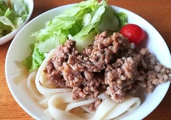 うどんに作り置きしておいた肉みそとレタストマトを乗せただけ。