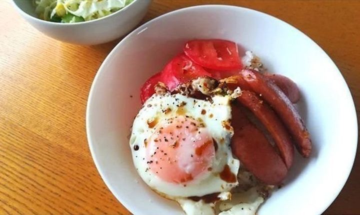 フライパンにオリーブオイルとにんにくチューブを少し入れて熱して、目玉焼きとソーセージを焼いて、お米に乗せておしょうゆと塩コショウで味付け。トマトを添えただけ。これは、サンキュ!の付録に載っていたレシピです。