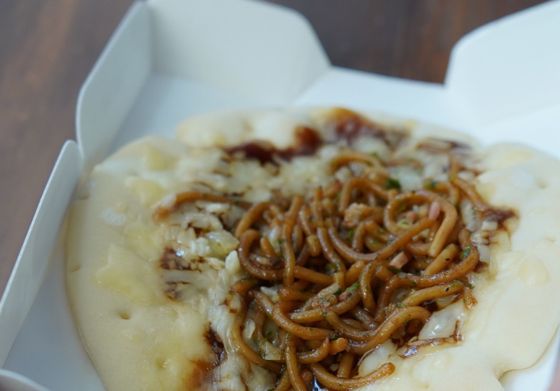 ふわふわした生地の上にゴーダチーズ・ウスターソース・やきそばソース。その上にやきそば・青のり・紅しょうがといわゆる王道のやきそばが。