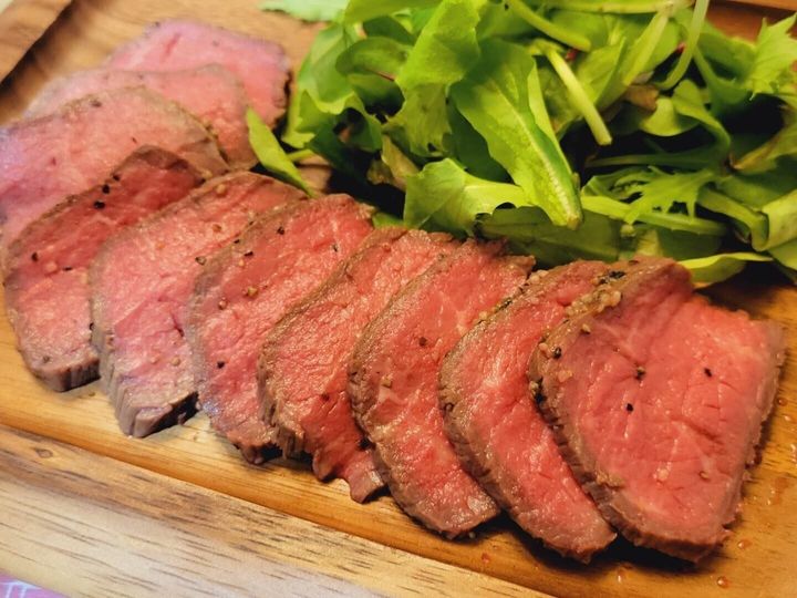 ①牛肉ももブロックにハーブソルトとすりおろしにんにくをまんべんなくすりこみ