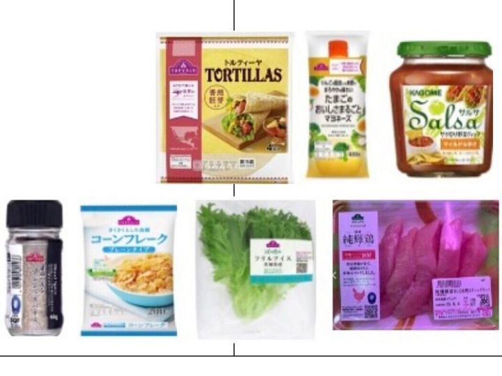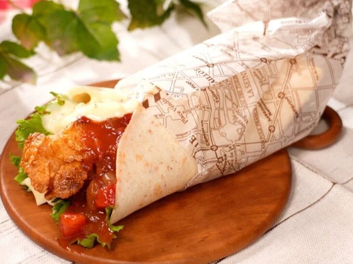 ③トルティーヤにフリルアイスをのせ、その上に揚げたチキンをのせて