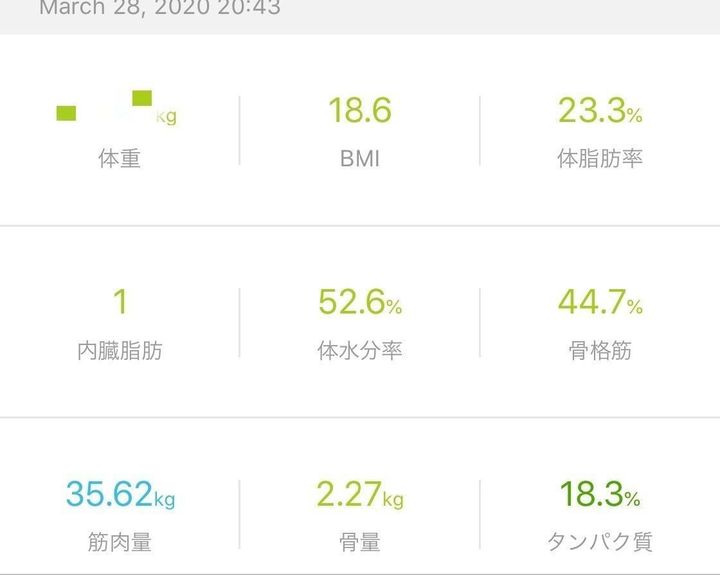 私が持っている体組成計は、写真のような状態でスマホに送られてきます。