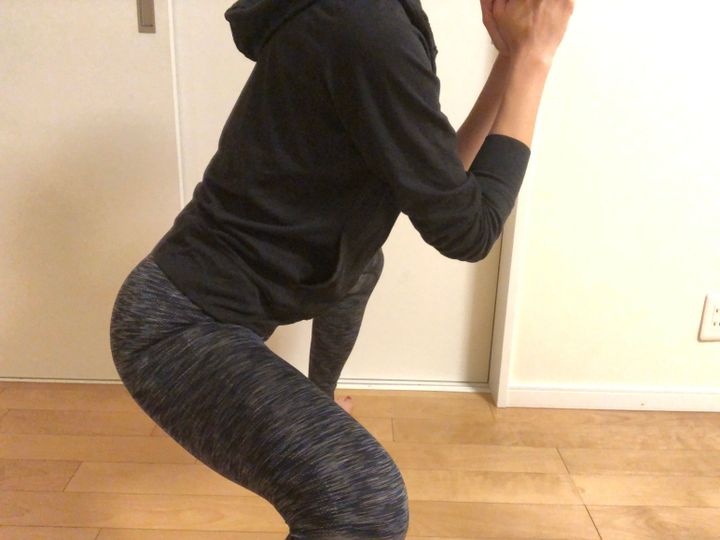 2、お尻を後ろに突き出すようにして、ゆっくり腰を落としていきます。
