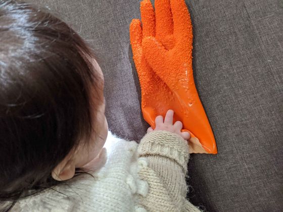 我が家のベビ蔵も、襲来したどぎつい手袋に興味津々でつんつんしたりつまんだりしております👶