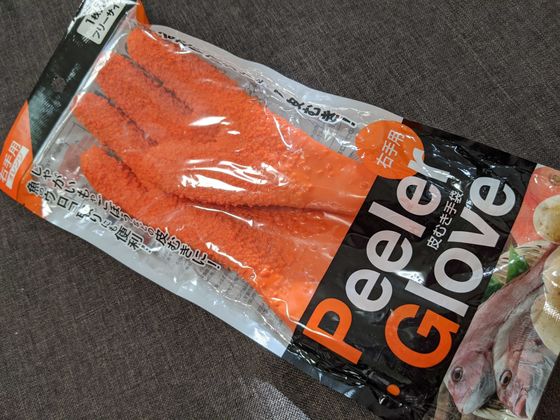 実はコレ、キャンドゥで販売されているPeeler Glove~皮むき手袋~という商品で、根菜類の皮を向いたり魚の鱗を向いたりできるゴム製の皮むき手袋なんです!