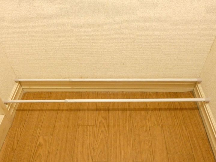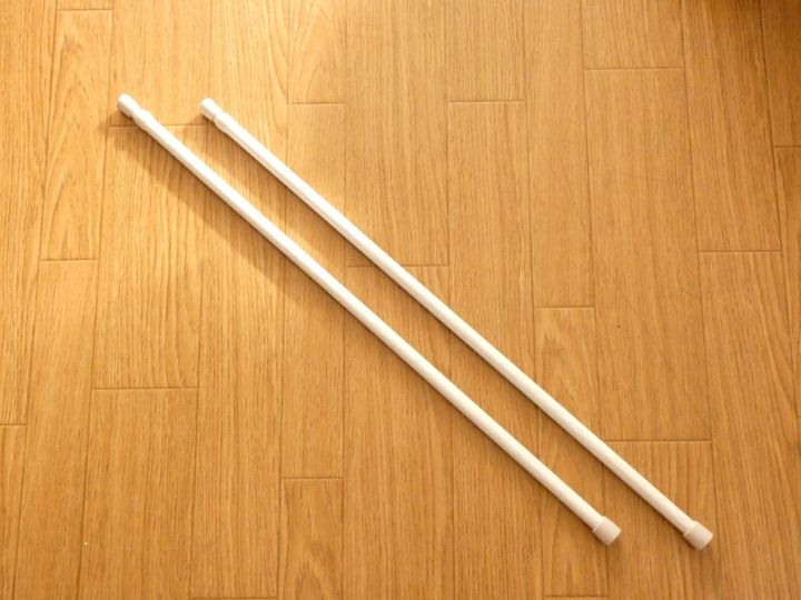 アレンジするのに購入したのはつっぱり棒2本と板1枚。つっぱり棒は100円ショップでちょうどいいサイズが見つけられました。板はホームセンターで薄いベニヤ板を購入し、ピッタリなサイズにカットしてもらいました。