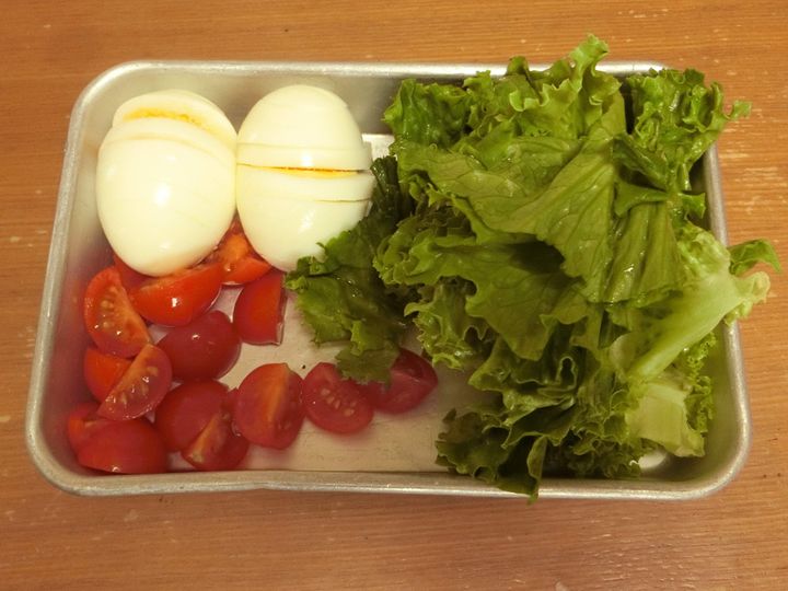 1.卵はゆでて輪切りにします。グリーンリーフは食べやすい大きさに手でちぎり、ミニトマトは4等分にします。