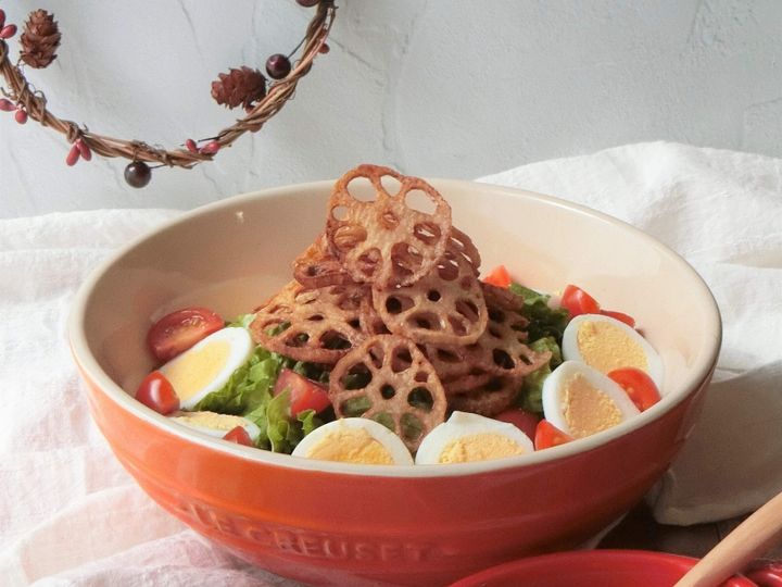 れんこんは酢水につけて、真っ白にしてから揚げるとキレイです。ツリーをイメージして、れんこんを高く積み上げると豪華に見えます。ドレッシングはお好みでOK。