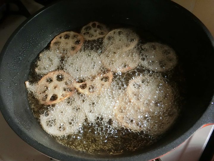 2.れんこんは皮をむいて薄切りにし酢水につけます。しっかり水気を切ったら油で揚げます。