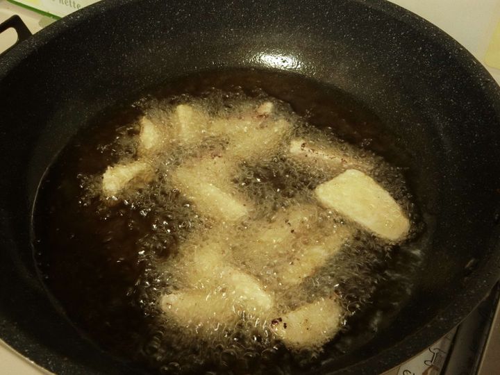 2.片栗粉をまぶし、180℃くらいの油できつね色になるまで揚げます。