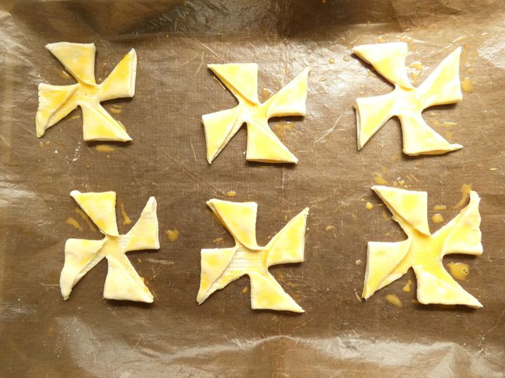 4.卵黄と水を混ぜ合わせ、ハケで塗ります。オーブン200℃で12~15分焼きます。