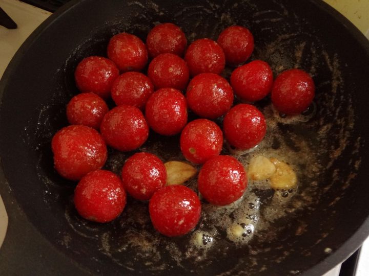 2.にんにくがきつね色になったらミニトマトを入れます。ミニトマトに割れ目が入ったら塩こしょうで味付けして完成。