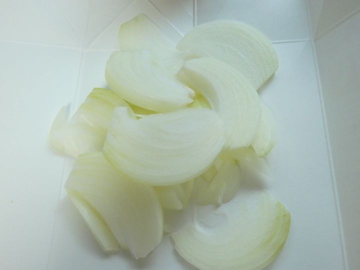 1.玉葱は薄切りにします。耐熱皿に入れてふんわりラップをし、電子レンジ600wで1分半加熱します。