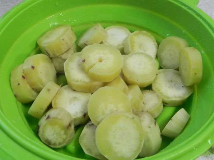 1.さつま芋は皮をむいて1cmくらいの輪切りにします。耐熱容器に入れてふんわりラップをし、電子レンジ600wで5~6分加熱します。