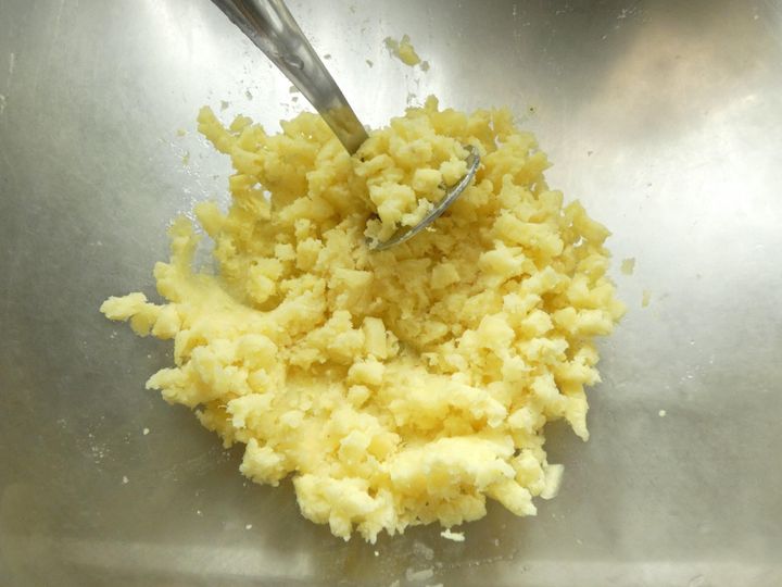 2.柔らかくなったら熱いうちにつぶし、砂糖とチョコレートを混ぜ合わせます。
