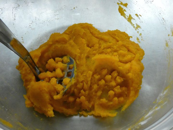 1.かぼちゃは皮をむいて小さく切り耐熱容器に入れます。ふんわりラップをかけ電子レンジ600wで5分加熱し、熱いうちにつぶします。