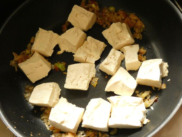 4.香りが出てきたら水切りした豆腐を手でちぎりながら入れます。