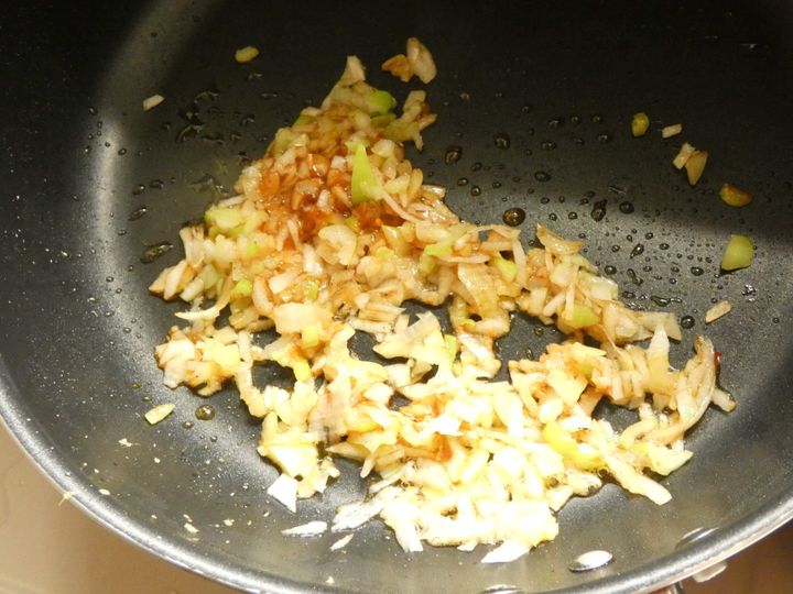 3.フライパンにごま油と長ねぎ、にんにく、しょうが、豆板醤を入れて炒めます。