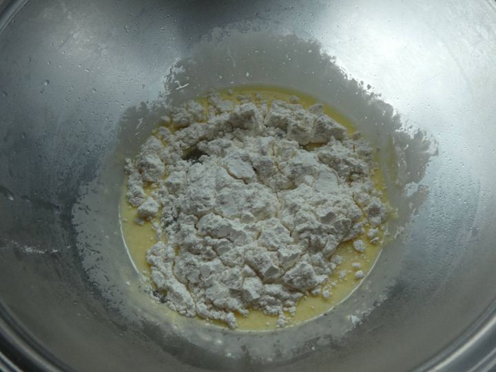 3.溶き卵を少しずつ入れてよく混ぜ合わせ、ゆっくり落ちるくらいの固さにします。