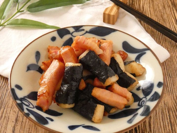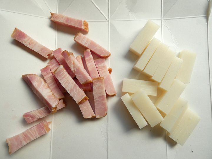 1.餅は6等分に細く切り、ブロックベーコンは餅と同じくらいの大きさに切ります。