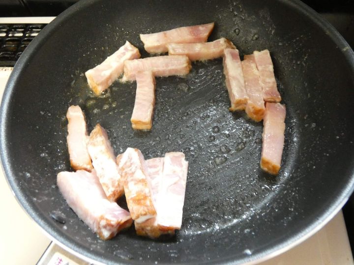 3.フライパンにマヨネーズとにんにく、ベーコンを入れて炒めます。