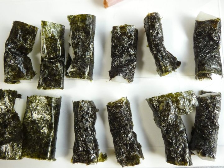 2.餅を耐熱皿に並べ、電子レンジ600wで30~40秒温めます。軟らかくなった餅を12等分にした海苔で巻きます。
