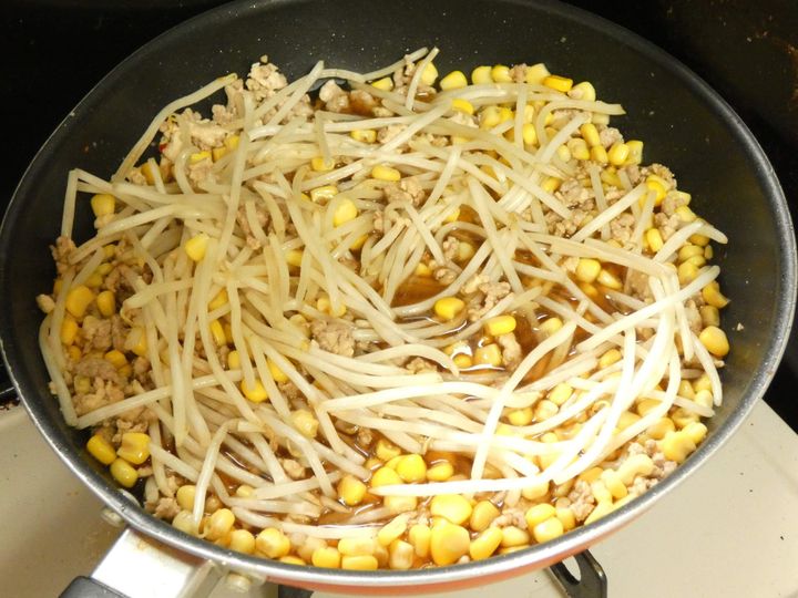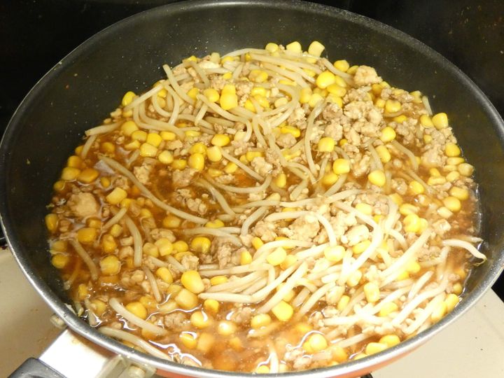 3.Aの材料を入れて2~3分火にかけたら、もやしとコーンを入れます。
