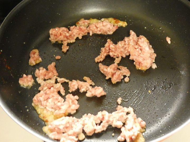 2.フライパンにごま油をひき、しょうが、にんにく、豆板醤を炒めます。香りが出てきたら豚ひき肉を入れ、色が変わるまで炒めます。