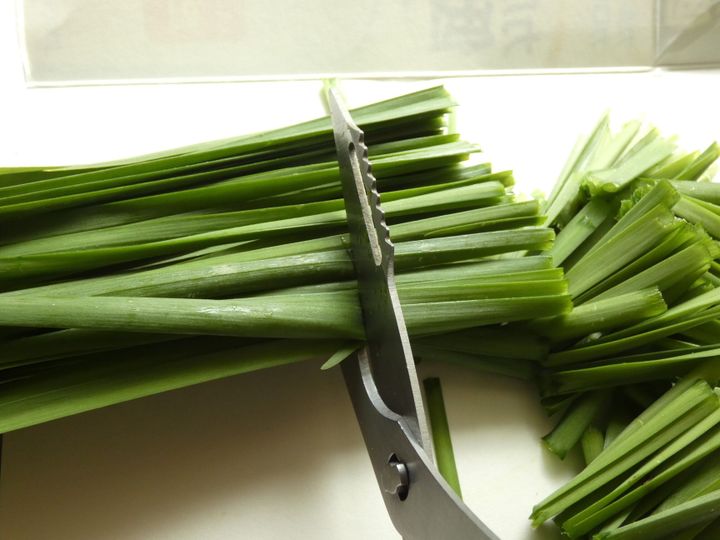 ニラの根元部分をよく洗い、泥を落とします。葉の部分はサッと洗いしっかり水分をとります。根元を1cmくらい落としたら、使いやすい長さにキッチンばさみで切ります。