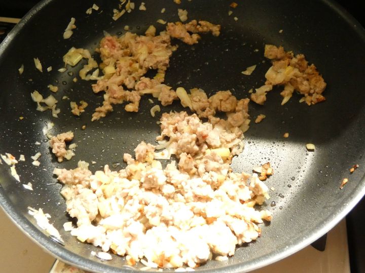 3.香りが出てきたら豚ひき肉を入れ、色が変わるまで炒めます。
